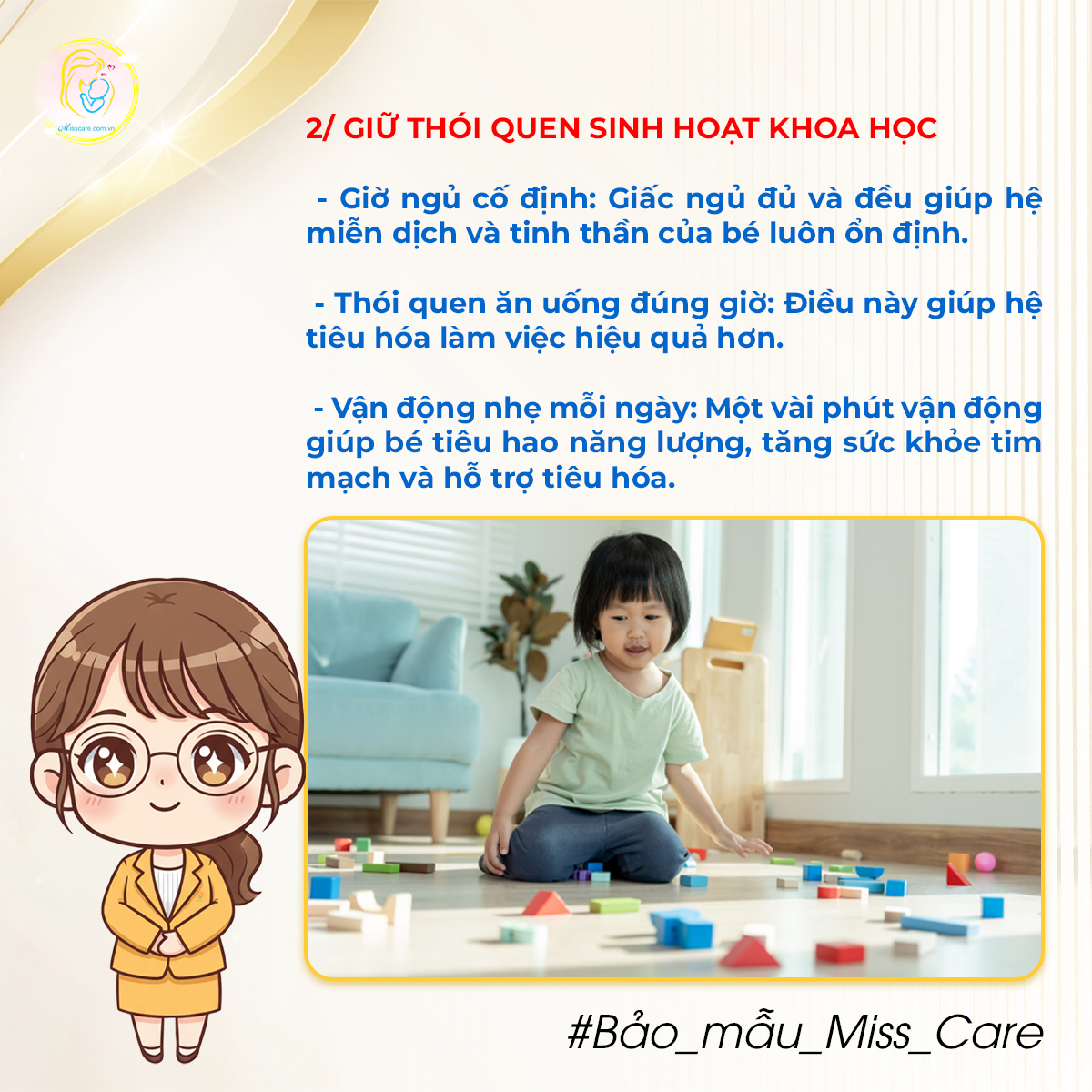 - Giờ ngủ cố định: Giấc ngủ đủ và đều giúp hệ miễn dịch và tinh thần của bé luôn ổn định.