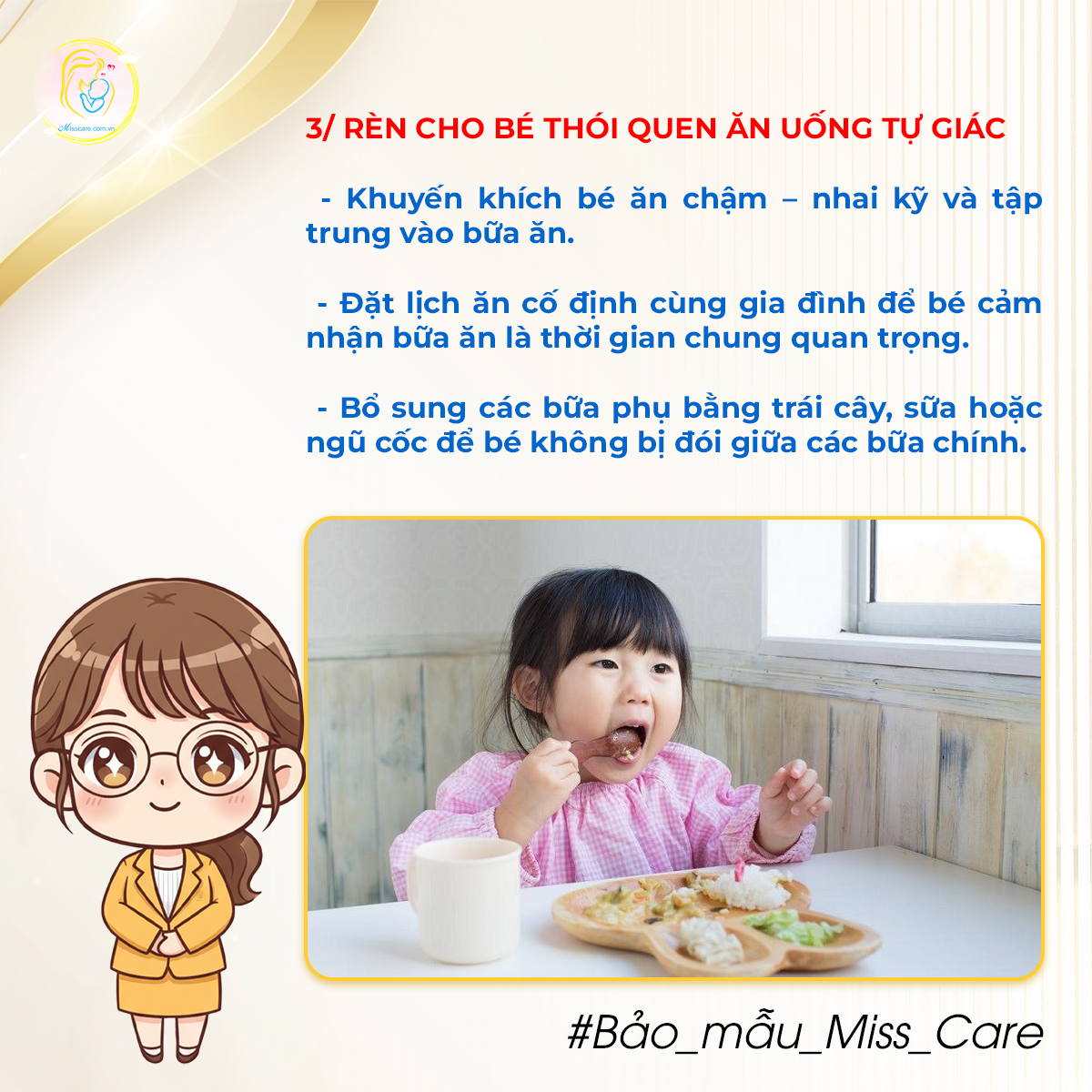 - Đặt lịch ăn cố định cùng gia đình để bé cảm nhận bữa ăn là thời gian chung quan trọng.